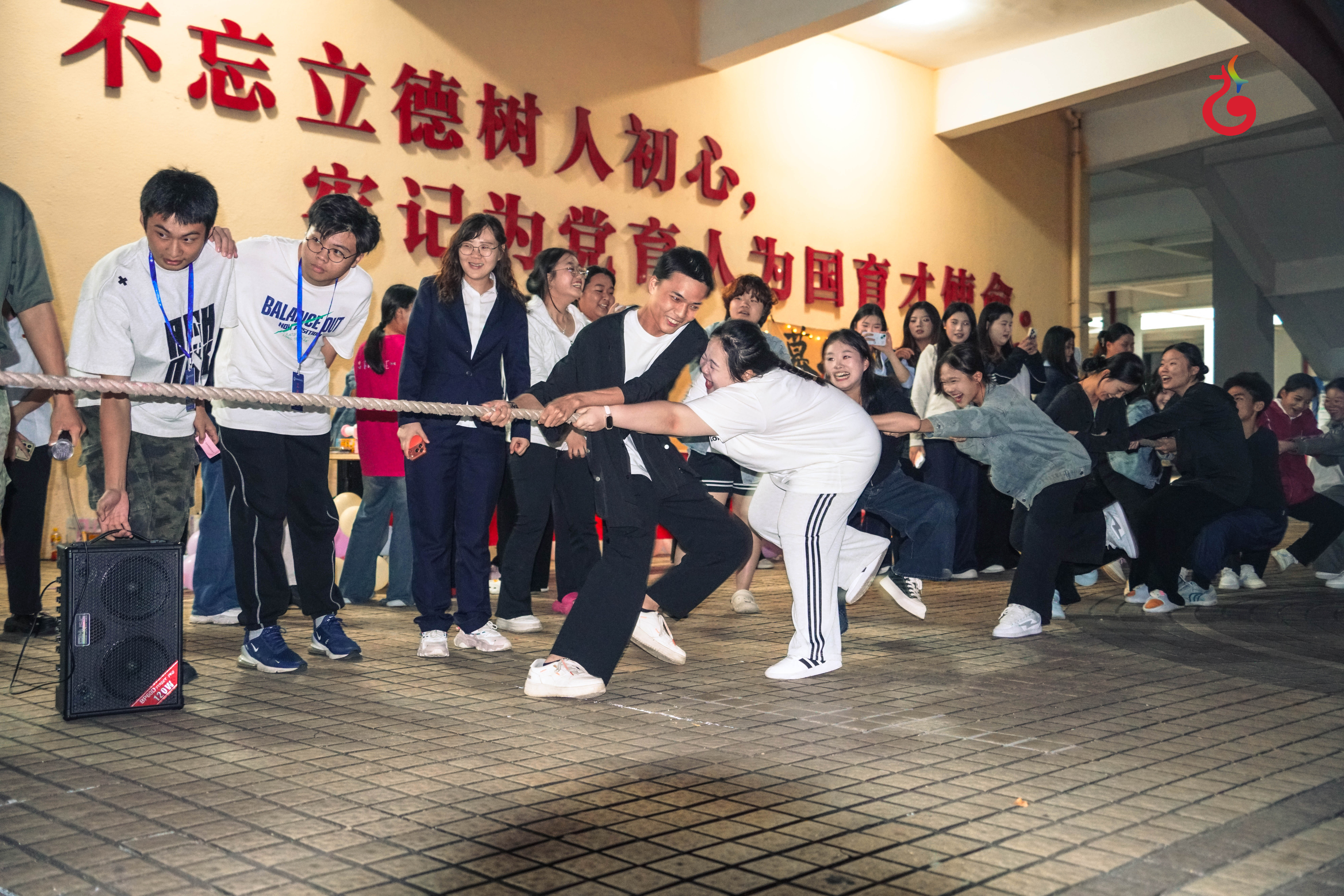 若说展演是温柔的抒情诗,拔河对抗赛便是激昂的战歌。宿舍成员们手攥粗绳,指尖紧扣,双脚如老树盘根般扎稳地面。“一二!一二!”的口号冲破暮色,裹挟着少年人的热血,在空气中震荡。汗水浸湿了衣角,却没有一个人松开手。围观的同学踮脚挥手,加油声似浪潮翻涌。胜负早已被抛诸脑后,此刻最珍贵的,是掌心相握的坚定,是并肩作战的默契,是青春里这份“同使劲、共进退”的滚烫情谊。